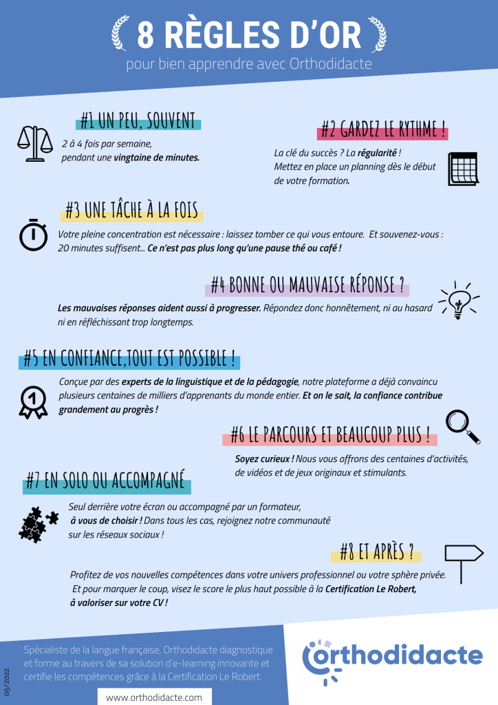 Vous avez été nombreux à nous les réclamer… Eh bien les voici ! Nos 8 règles d’or qui vous aideront à profiter de notre plateforme Orthodidacte à 100 % ! Sachez que celles et ceux qui les suivent progressent 3 à 5 fois plus vite que les autres. Aucune excuse : notre plateforme est en ligne 24 heures sur 24 et 7 jours sur 7.